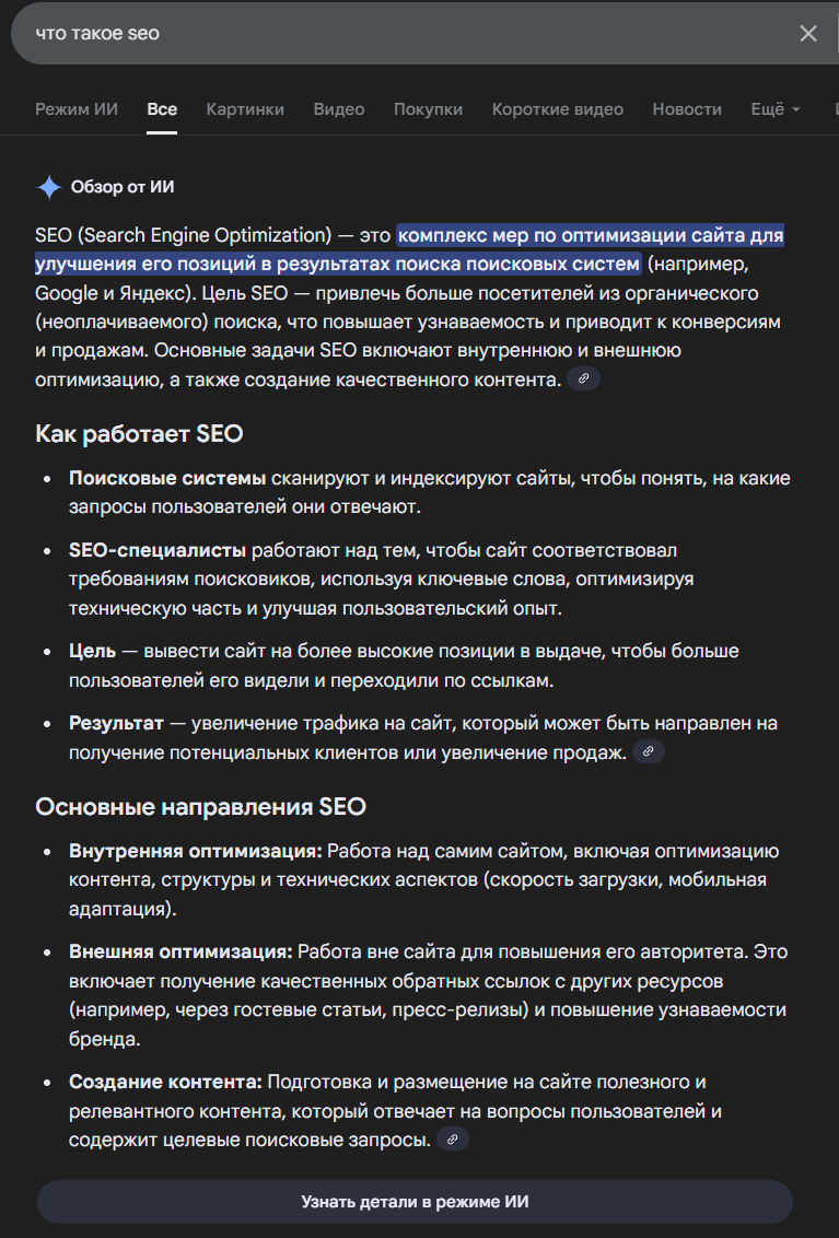 Это значит одно: если ваш сайт не проиндексирован, не соответствует техническим стандартам или не структурирован для машинного понимания — его просто не включат ни в SGE, ни в Нейроответы. Вы автоматически выпадаете из новой поисковой игры.